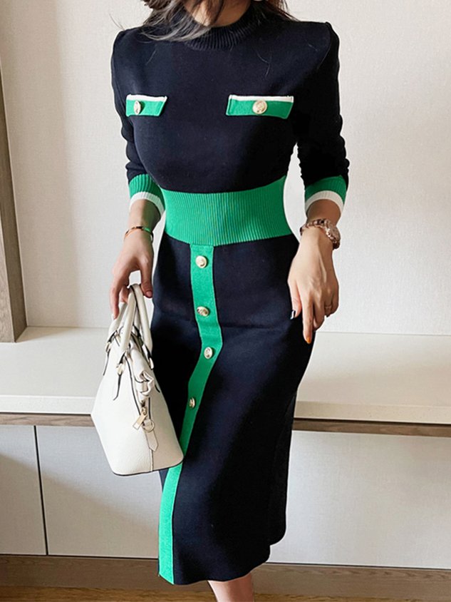 Elegant Color Block Tight Long Sleeve Midi Dress