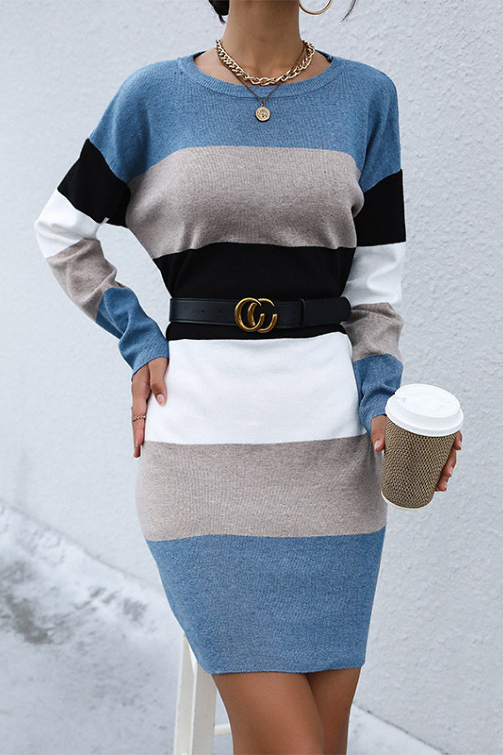 Striped Crewneck Sweater Dress without Belt